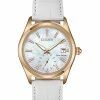 - Black dial with luminous pink gold-tone hands and index hour markers