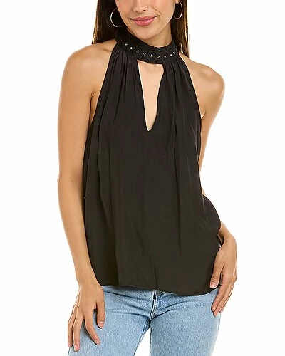 - Animee Top in black with studded mock neck, ruffle trim, and keyhole front