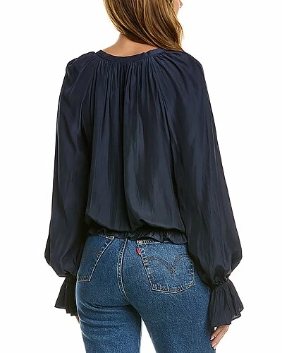 - Brielle Top in navy with shirred neckline, elasticized flounce cuffs, and elasticized hem