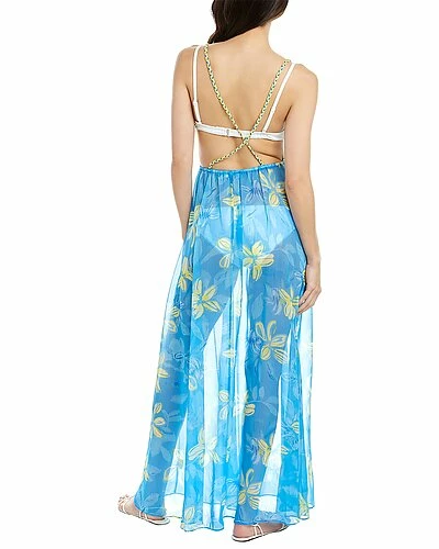 - Cienna Midi Cover-Up Dress in wave combo with crisscross braided shoulder straps, elasticized waist, and open back
