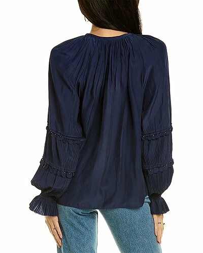- Coco Top in spring navy with shirred neckline, accordion pleated balloon sleeves, and decorative trim