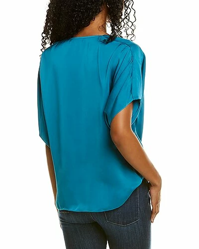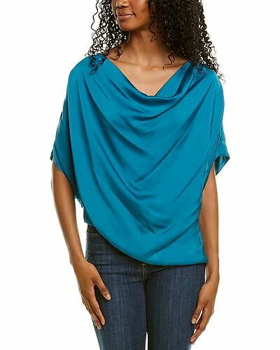 - Dorothy Top in petrol with satin design, cowl neck, and draped sleeves