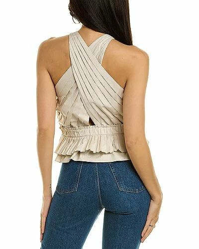 - Grace Top in sandstone with pleated crossover design, keyhole cutout, and tiered peplum hem