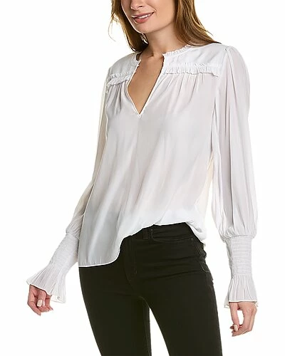 - Imanke Top in white with mock collar, ruffle trim, and smocked cuffs
