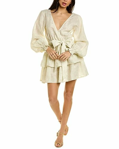 - Jolie Linen Mini Dress in bone and ivory with surplice bodice, tiered hem, tie sash at waist, balloon sleeves