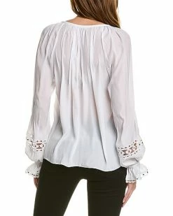 - Kashmeela Top in white with shirred neckline, blouson sleeves, lace trim, and elasticized cuffs