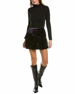 - Malbec Silk-Blend Skirt in black multicolor with velvet design, asymmetrical ruffle trim, and ruched trim