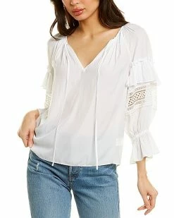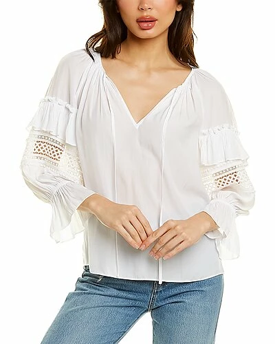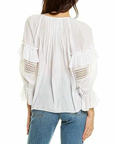 - Mara Top in white with split neckline with self-tie closure, lace and ruffle trim and elasticized flare cuffs