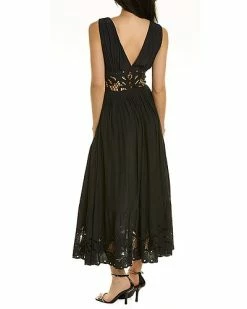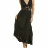 - Monique Midi Dress in black with halter mock neck, gathered detailing, embroidered lace waist, and asymmetrical hem