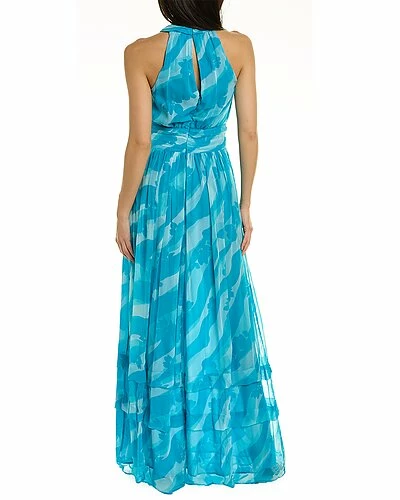 - Printed Zoya Maxi Dress in lagoon combo with crossover halter neck, keyhole cutout at front bodice, and tie waist