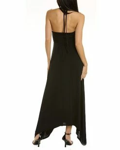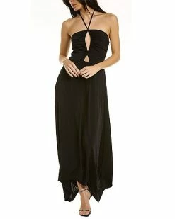 - Samba Maxi Dress in black with self-tie halter neck, open back, shirred keyhole cutout bodice, and handkerchief hem