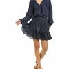 - Timothy Dress in navy with foldover neckline, asymmetric blouson sleeves, elasticized cuffs, and smocked waist