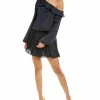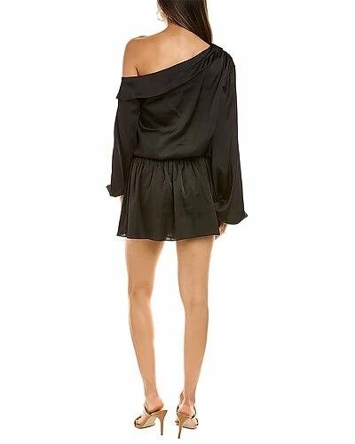 - Timothy Dress in black with foldover neckline, asymmetric blouson sleeves, elasticized cuffs, and smocked waist