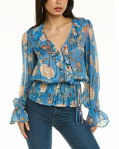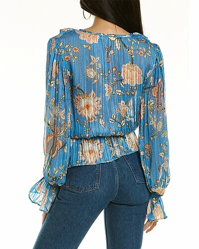 - Veronica Blouse in ocean combo with ruffle trim at neckline, drawstring peplum hem, and elasticized flounce cuffs