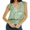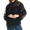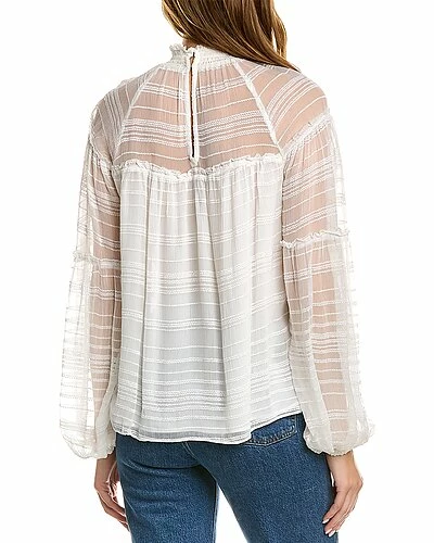 - Winslow Silk-Trim Top in ivory with embroidered chiffon design, smocked mock neck, and bishop sleeves